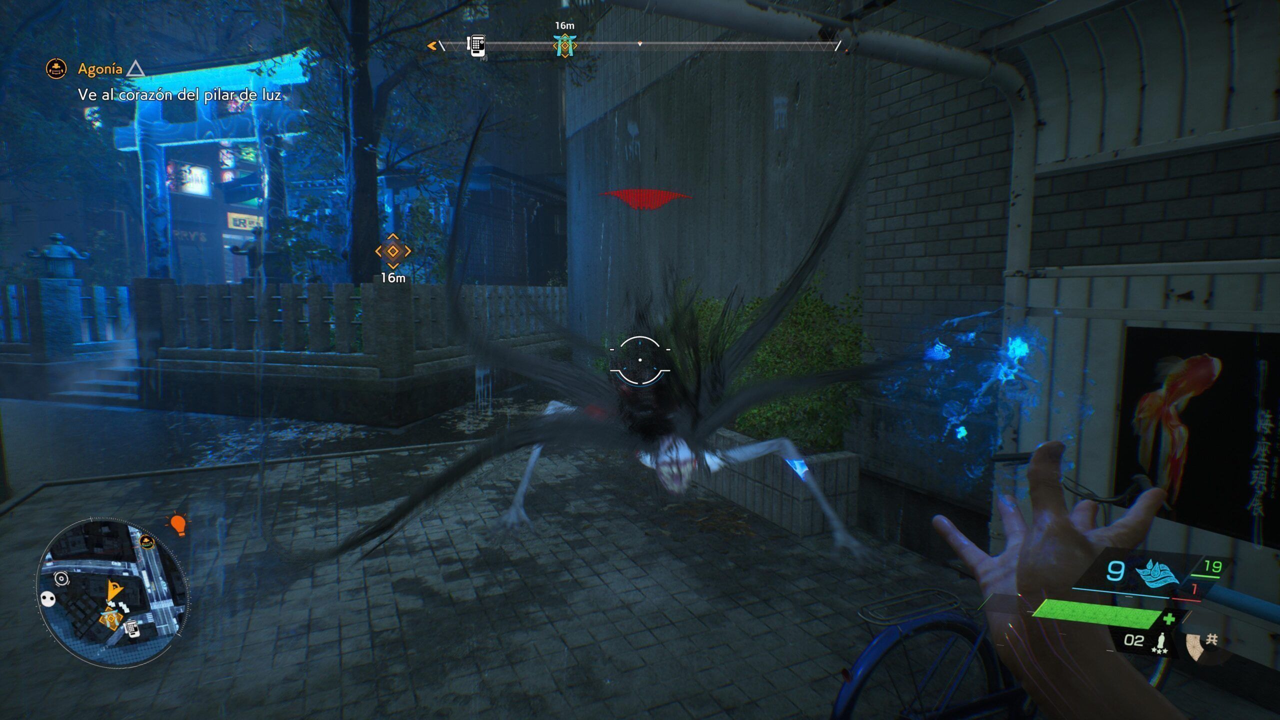 La puesta en escena nos pone a tono y promete, pues la cuidada factura del título, el amor por el detalle y la maravillosa ambientación (Shibuya es una auténtica maravilla) son ingredientes más que suficientes para dar forma a una experiencia capaz de cautivarnos desde el primer momento. Además, el control es una delicia y la exploración sorprende gracias a su verticalidad; poco tardamos en descubrir que podemos escalar y hacer uso de diversas mecánicas que nos permiten ascender a los tejados más altos de la ciudad, saltar y planear entre ellos. Hay que decir que es muy cómodo y gratificante jugar a Ghostwire Tokyo, un título que a menudo se muestra sofisticado en este tipo de aspectos.