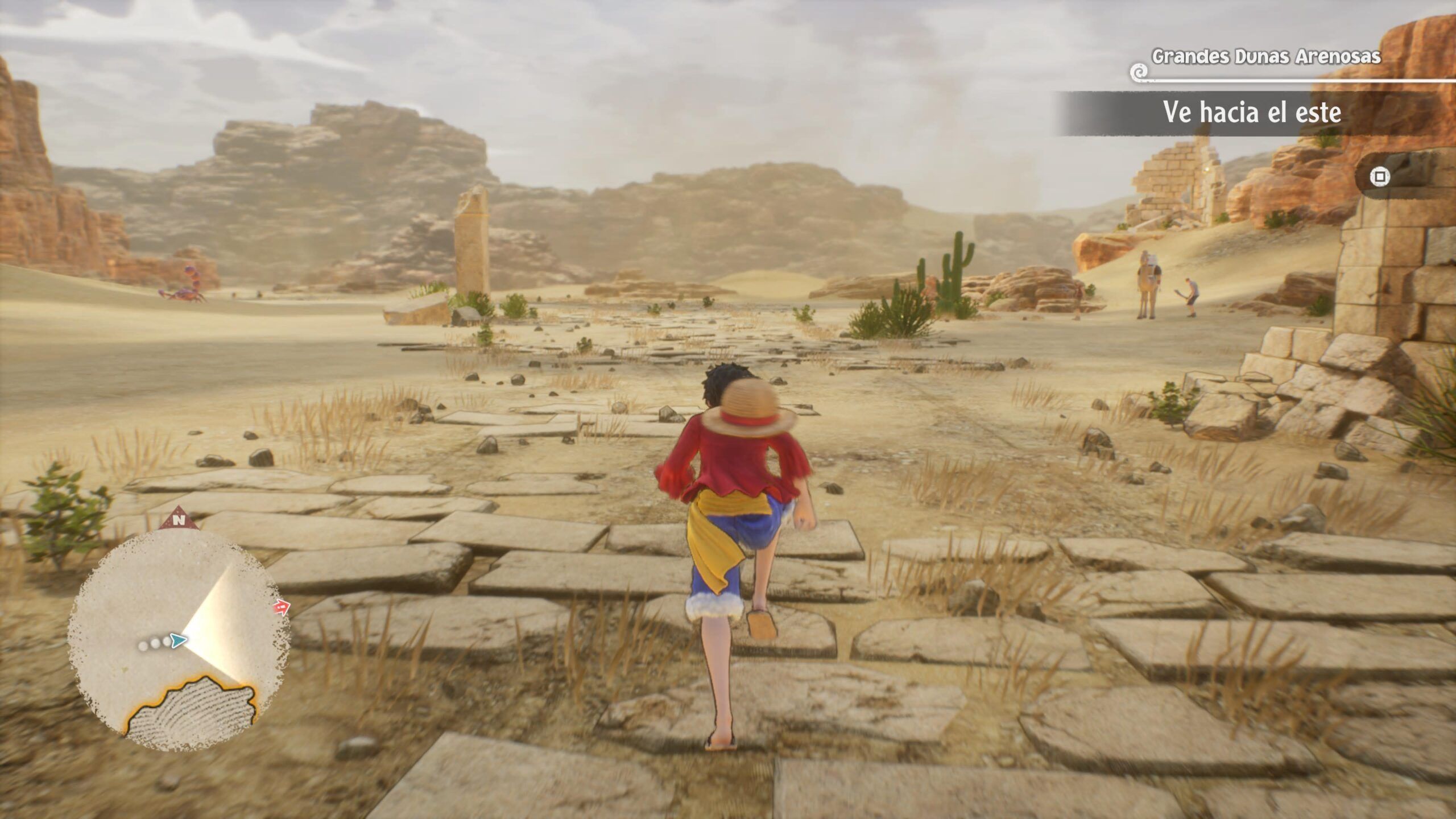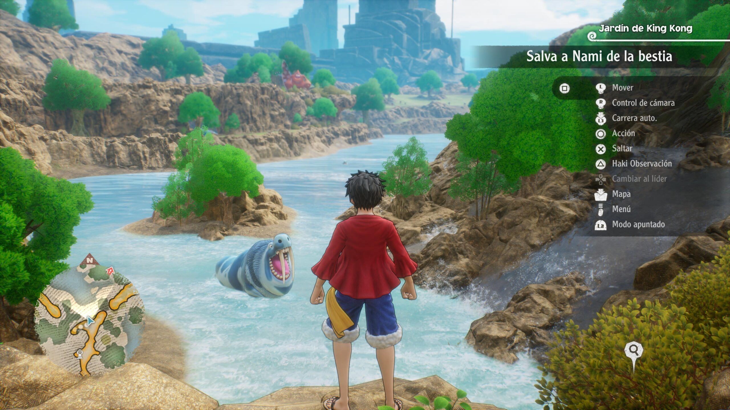 Algo que nos ha gustado mucho ha sido la exploración, ya que a menudo vemos cofres cerrados con llave, ruinas y lugares a los que no podemos acceder en el momento en el que los visitamos por primera vez y elementos con los que no podemos interactuar hasta más adelante. Esto se compenetra muy bien con el uso de habilidades de campo (Luffy puede alcanzar posiciones elevadas usando sus brazos como gancho, Zoro puede destruir puertas especiales con su espada…). Como decimos, cuando jugamos lo hacemos siempre pensando en lo que todavía nos queda por descubrir.