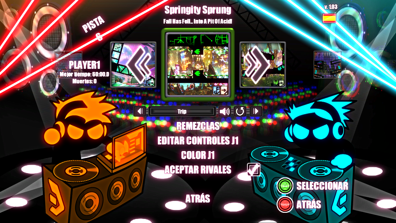 Con todas esas ideas que he planteado en la introducción me enfrentaba a un plataformas distinto y lamentablemente no las he encontrado por ningún sitio. La unión de música y plataformas no está implantada. Pensaba en modificaciones de la música según saltaba o lograba pasar algún reto, algo como Rez. Pero no, solo sirve para amenizar y dar ritmo a la partida. Eso si, el apartado musical es muy bueno, faltaría más, y los temas están perfectamente elegidos.
