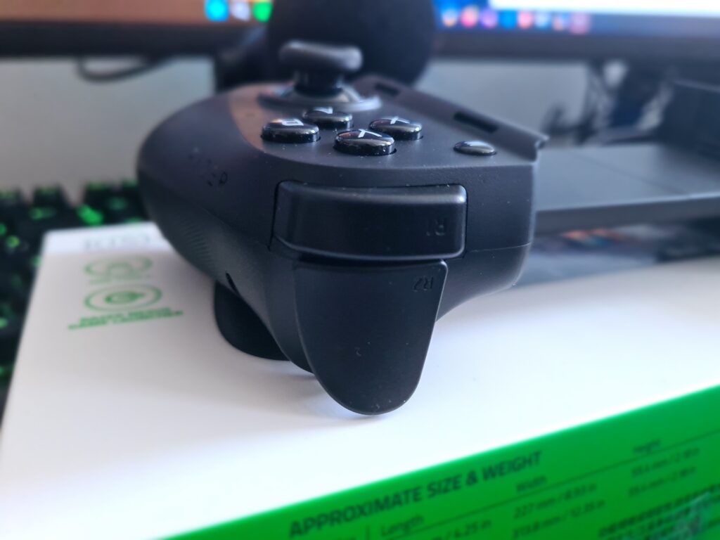 En la parte trasera nos encontramos con dos botones que hacen las función de doble clic rápido en los juegos, pero que podemos configurar en el software Razer Nexus. Una de las cosas que más me ha gustado es que pesa bastante poco, menos de 200 gramos y el tamaño es lo suficientemente grande para que no parezca un pegote de juguete cuando lo conectamos al móvil. He estado jugando varias horas con el y la verdad es que es un mando muy cómodo.