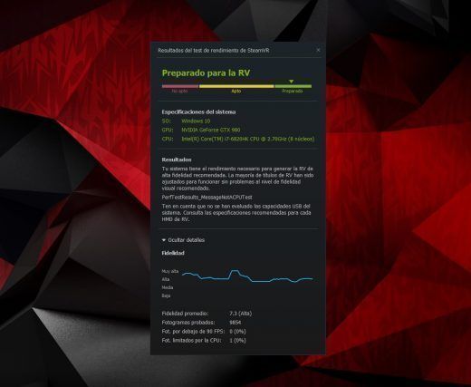 También hemos realizado el test de Valve y HTC VIVE para ver si este ordenador es compatible con los cascos top de Realidad Virtual como los ya nombrados u Oculus Rift. No esperábamos menos, y un resultado menos nos habría sorprendido.