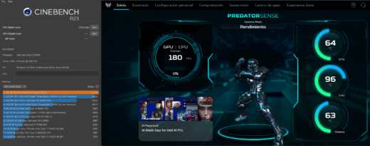 Empezamos por las pruebas de CPU, para realizarlas hemos utilizado Cinebech R23, test de 10 minutos y el propio programa de Acer para medir las temperaturas: