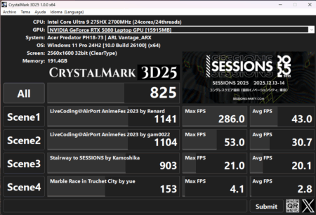 Pasamos al resto de test, esta vez para la tarjeta gráfica. Hemos probado con CrystalMark 3D25, con una puntuación como veis abajo de 825 puntos.