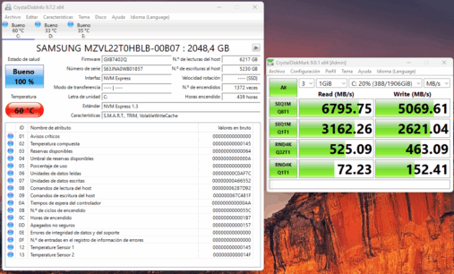 En las pruebas completas conseguimos velocidades de casi 7000 MB/s en lectura y 5000 MB/s en escritura. La temperatura llegó a los 60 grados, pero bajó rápidamente después de terminar los test.