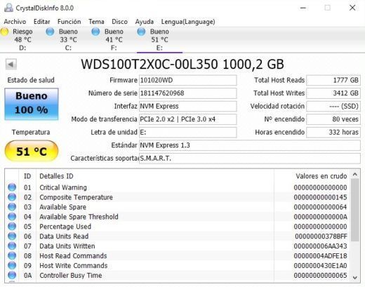 Estos son los datos técnicos del Western Digital NVMe SSD WD Black que nos da la aplicación Cristal Disk Info: