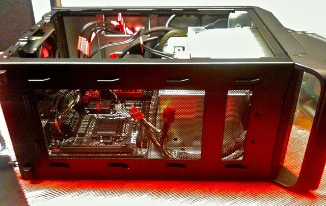 La caja mide 345.8 x 277.3 x 175.7 mm. y viene con una placa base MSI Z87I Gaming Nighblade para I5 e I7, diseñada para el tamaño de la caja, capaz de soportar 16 GB de memoria DDR3 hasta 3.000 MHz y una fuente de alimentación con una potencia de 600 w. La distribución de la caja permite que podamos ponerle hasta 3-4 discos duros de diversos formatos, además de poder alojar tarjetas gráficas de doble ranura.
