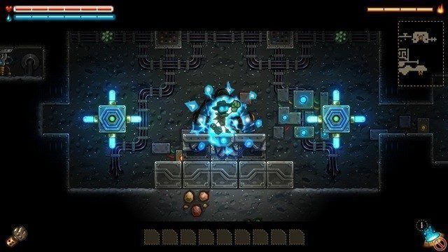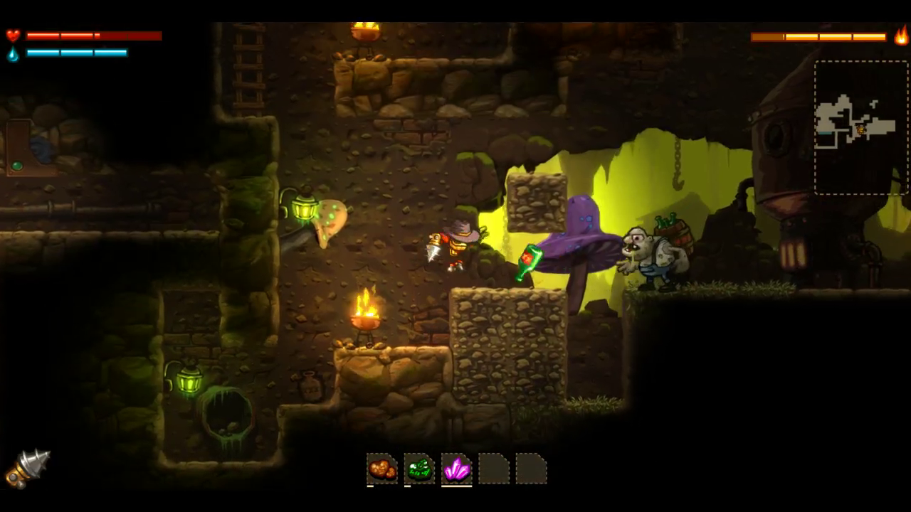 ¿Qué pasa cuando morimos? Que nuestro paradero reaparecerá en la superficie con las manos vacías. Todo nuestro arsenal nos esperará allá donde sucumbiésemos. Dicho esto, puede dar la sensación de estar haciendo todo el rato el mismo esquema de juego mientras seguimos sumergiéndonos en un vete-tú-a-saber-dónde. Con todo, irán apareciendo nuevos enemigos, cada vez más complejos y expuestos. Sentiremos más de una vez que la aventura se va acomplejando más rápido de lo que nosotros mejoramos per se. Y me ha encantado. Me ha encantado esa necesidad de adaptarte a la situación, teniendo que dar marcha atrás a buscar mineral a la desesperada para tener el dinero suficiente para comprar un corazón más de vida o algo de dinamita que tan bien nos vendrá en según qué zonas.