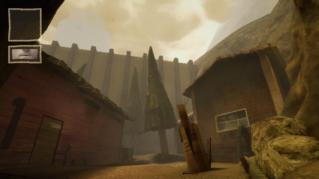 Entre soplada y soplada, podemos dar unas vueltillas por la escueta zona y ver la pintoresca vida del soplador del tren. Los dos edificios, uno con puerta, otro, misteriosamente cerrado. La máquina de procesado de materia orgánica para recibir… ¿un ticket? Y la consecuente máquina que utiliza dichos billetes. También en dirección al río puedes ver los andamios que… alguien construyó, y un sonido. El de otra máquina que expide los billetes. Acercándote, ves… ¿Qué es eso?