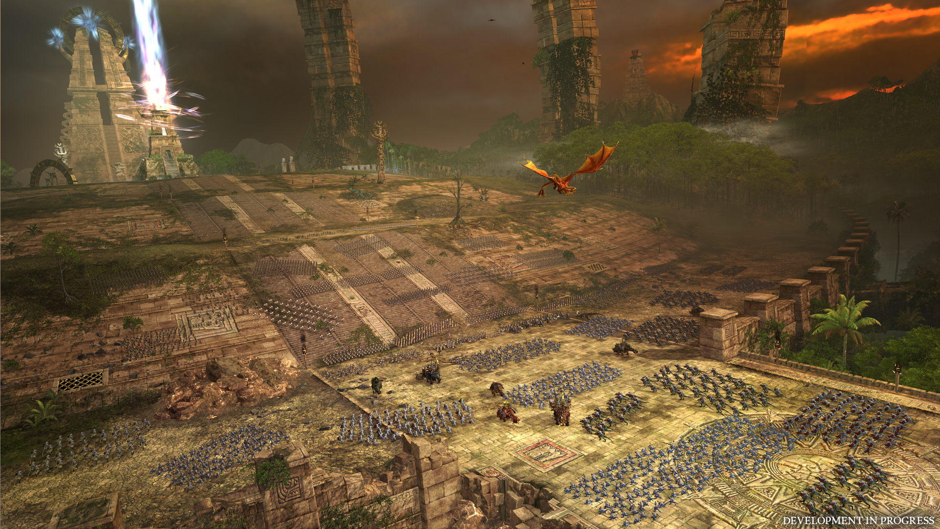 Con todo y como ya he mencionado, el mapa se ha expandido hacia Occidente, en el llamado “Nuevo Mundo”, y en el que hayamos, al menos, unas cuatro nuevas regiones o continentes. Como cabe esperar, son similares en cierto modo a América, África, y a esa hipotética Atlántida que debería existir en medio del Atlántico. Siguiendo con esos paralelismos con el Mundo Real, podemos observar dentro del juego como se encuentran colonias de humanos en el sur de lo que sería América, en cierto paralelismo a esos primeros colonos. Las nuevas regiones son, por tanto: Ulthuan (esa mentada Atlántica) que es una isla con forma de cruasán en la que habitan los Altos Elfos, Arabya (similar a África) y en el que no hay ninguna raza concreta pero que intuimos traerá algún DLC, Naggaroth (América del Norte) donde habitan los Elfos Oscuros, y Lustria (América Central y del Sur) donde habitan los Hombres Lagarto y los Skavens. Podéis ver el Nuevo Mundo en todo su esplendor aquí.