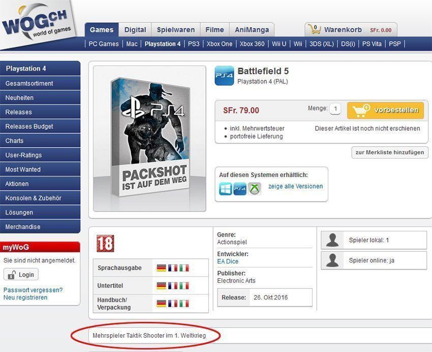 Según esta tienda, el juego saldría a la venta el próximo 26 de octubre y, agarraos los machos, estaría ambientado en la Primera Guerra Mundial. ¿Las plataformas? Las habituales: PC, PS4 y Xbox One.
