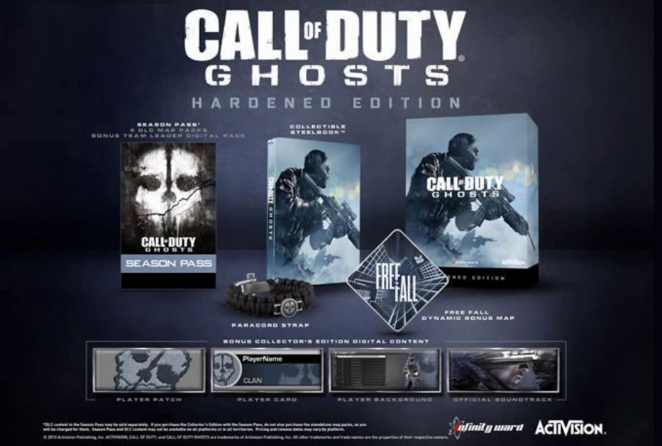 La edición «básica» que mantiene el nombre de otros años «Hardened Edition» traerá consigo la caja metálica de turno con un concept art del juego, acceso al mapa dinámico Free Fall, Season Pass que nos garantiza 4 futuros packs de mapas gratuitos y un bonus, una pulsera con el logo de Ghost que se intuye de gran calidad`, similar a las que se usan para asegurar objetos a la muñeca como cámaras de fotos. Además de algunos bonus para personalizar nuestra ficha de jugador y la banda sonora del juego.