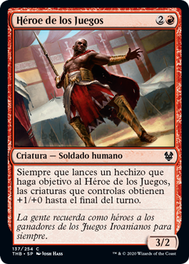 El nombre es bastante curioso «Héroe de los juegos» lo que implica que en Theros se celebran unos juegos a modo de circo romano, los cuales, en la anterior visita al plano, no teníamos constancia de ello. Esto parece poco relevante pero se podría especular con la aparición de más criaturas relacionadas con estos juegos o este momento de la historia. Cuando alcancéis la habilidad entenderéis porque digo esto.