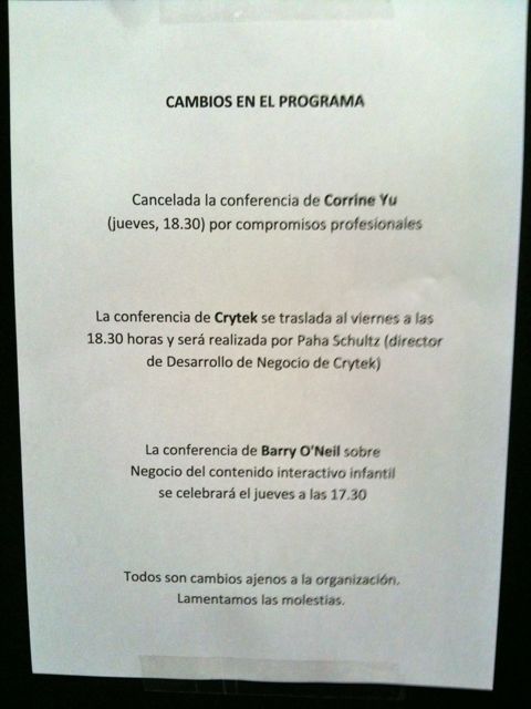 Al salir de estas conferencias y prepararnos para comer o las siguientes conferencias toda la gente se encontró con las primeras, y por suerte, únicas cancelaciones de la feria, y cambios de horarios. Esto no sería grave si no fuera porque me pareció ver a Corrine Yu durante la gala de premios y la conferencia de Seropian. No puedo decir a ciencia cierta que fuera ella, pero el parecido era bastante alto.