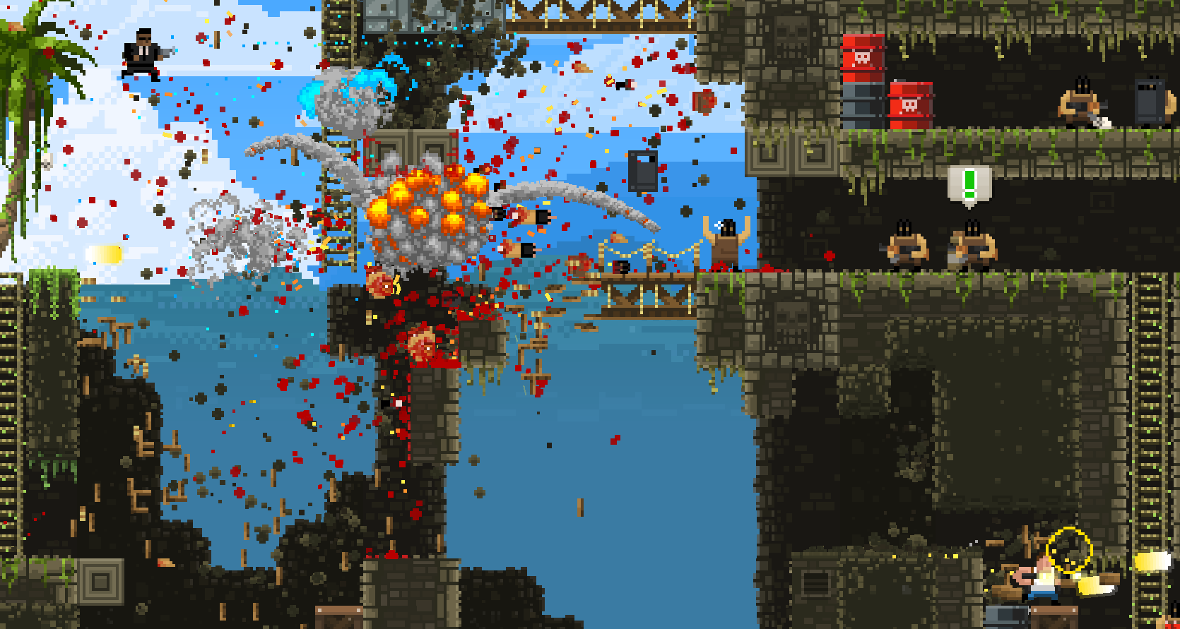 Como bien apuntaban en «Rock, Paper, Shotgun» en Broforce «No Emotions, Just Explosions» pues va de eso, de avanzar por niveles con un diseño muy básico, reventando terroristas, «cavando» el terreno a base de tiros y explosiones y llegando al final para ser rescatados por un helicóptero, en el camino deberemos salvar a nuestros «Bros» y cada vez que salvemos a uno, nuestro personaje cambiara a cualquiera del elenco de manera totalmente aleatoria, lo que dota al gameplay del juego de un dinamismo magistral.