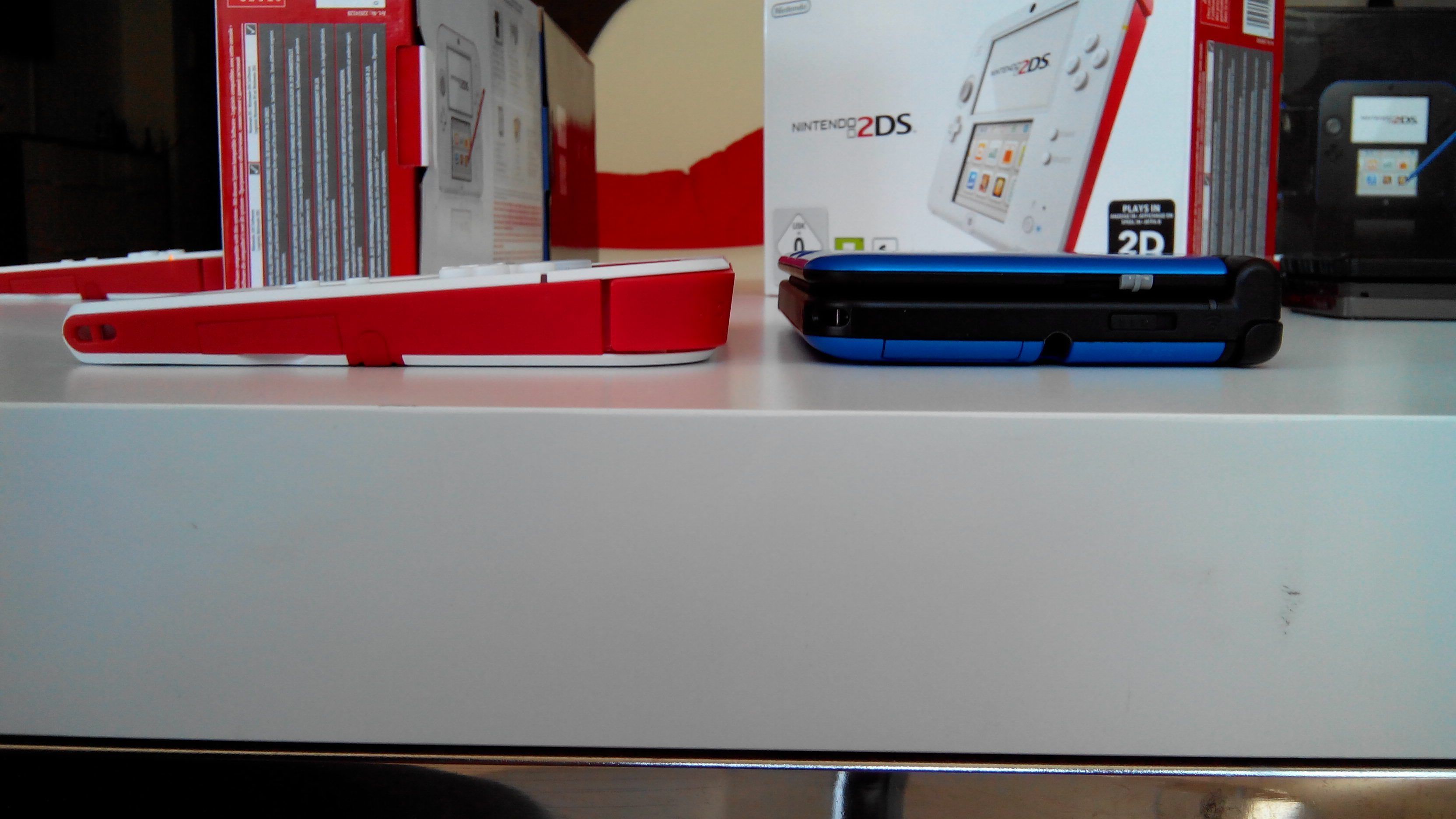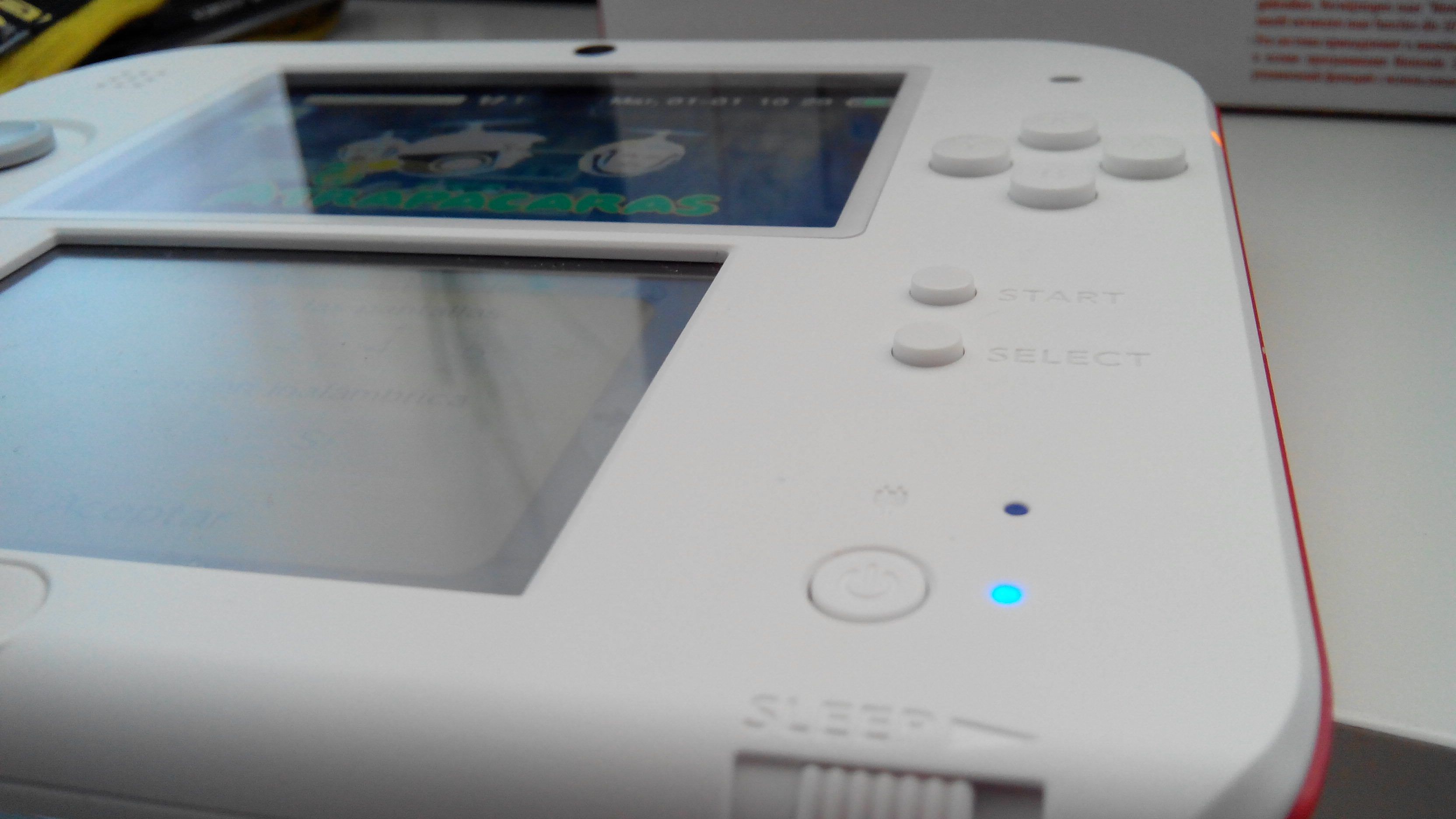 Desde Kyoto eran conscientes de esto, a pesar de que en los diseños anteriores nunca ha sido obligatorio el uso de esta tecnología (de ahí mi sorpresa inicial ante este movimiento), han decidido eliminar el efecto 3D para abaratar costes y ofrecer un modelo más barato (129 euros en Europa, 129 dólares en América…). A su vez, 2DS elimina las bisagras, no se puede cerrar, es un diseño plano. Como podréis ver en las fotografías su tamaño es mínimamente menor al de una N3DS abierta. El tamaño de las pantallas es igual al de una 3DS, tanto la superior como la táctil. Otro aspecto que varía es la pérdida del sonido estéreo, ahora tenemos un único altavoz en la parte superior izquierda. Destaca que, a pesar de no ser 3D, contamos con dos cámaras en la parte trasera, ya que las funciones de la consola son exactamente las mismas, no se elimina nada, ni en conexiones ni en opciones del software. Sigue siendo wifi. Contamos con la posibilidad de realizar fotografías y mandarlas a nuestra 3DS convencional para visualizarlas en tres dimensiones.
