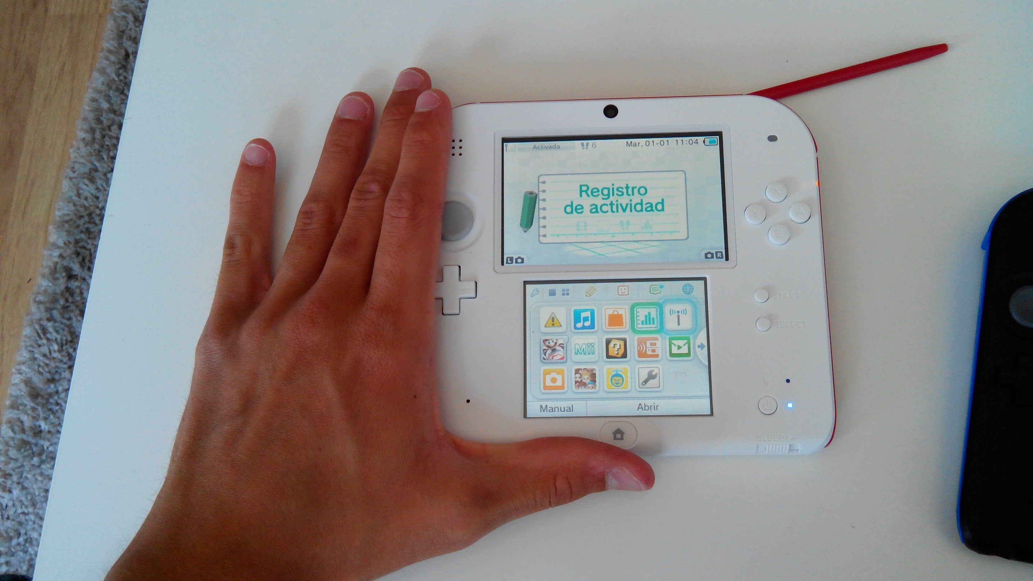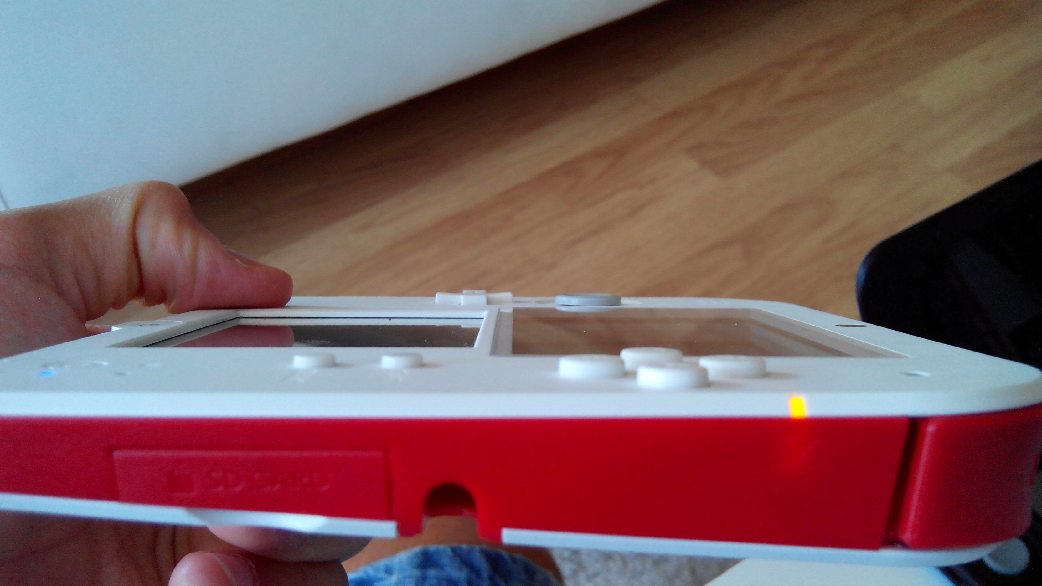 Otro aspecto es que seguimos contando con la posibilidad de adaptar una muñequera o similar en las dos esquinas inferiores. El adaptador de corriente se sitúa en la parte superior izquierda, y sí, el cargador es el mismo, por si alguien lo temía. Contamos de nuevo con un puerto inflarrojo, justo encima de la entrada de tarjetas 3DS/NDS, y por tanto mantenemos la retrocompatibilidad al 100% con su antecesora, algo a agradecer ya que contamos de nuevo con dos consolas y un catálogo disponible inmenso. Decir también que la portátil es gradualmente más ancha a medida que nos acercamos a la zona superior, abarcando desde un centímetro a unos dos centímetros en la parte final. Apuntar que la sensación de la pantalla superior es de estar muy metida hacia adentro, quedando una distancia de más o menos tres o cuatro milímetros entre la pantalla propiamente dicha y el cristal que la recubre. Esperemos que esté bien aislada del polvo, porque si no esto se me antoja como un problema bastante incómodo. En la pantalla táctil no ocurre, el panel está “pegado” totalmente. Finalmente, decir que el puerto de MiniSD se abre con una solapa de forma distinta a los anteriores modelos, siendo más difícil de romper.