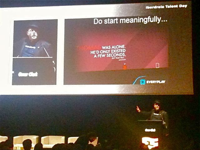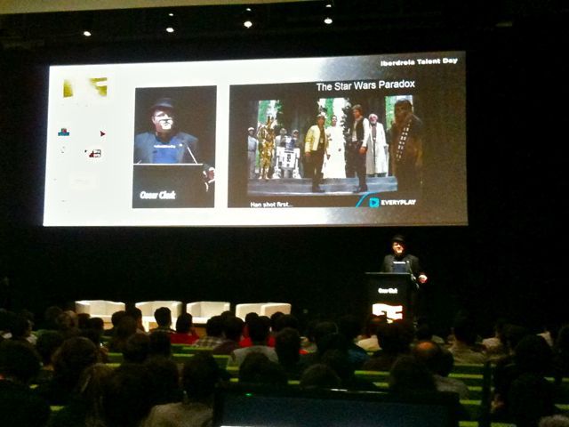 La siguiente conferencia fue la de Oscar Clark, Consultor de Everyplay en Unity Technologies, con su particular estilo y sombrero, que abordó el tema de juegos en plataformas móviles y de como sobrevivir en un sector saturado de ideas y de proyectos. Una charla que parecía normalita acabó siendo muy interesante por los consejos que daba y las referencias que usaba como ejemplos para ilustrarnos.
