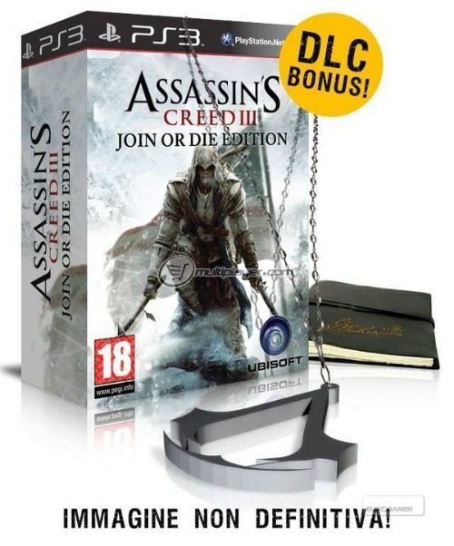 La web italiana Multiplayer acaba de desvelar algunos detalles de las ediciones especiales del esperado Assassins Creed 3. La primera de las dos ediciones que hemos podido ver se llama Join or Die e incluirá una especie de diario, un collar con el símbolo de la serie y un DLC gratuito. La segunda, de la cual desconocemos el nombre, traerá el diario de George Washintong, una medalla y dos DLC’s, uno para el modo multijugador, llamado Sharpshooter y la misión Ghosts of War para la campaña.