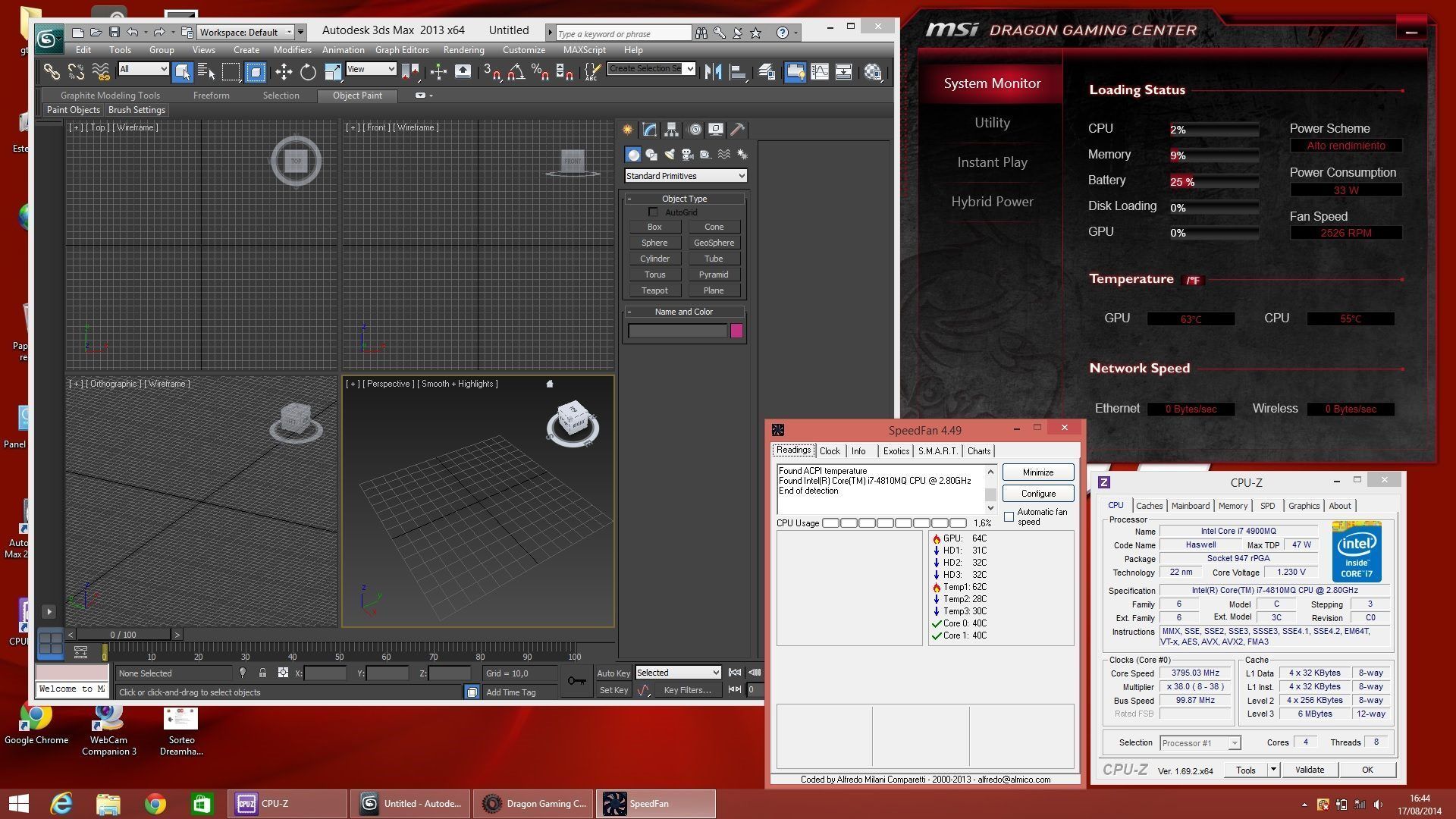 Nos encontramos con un «portátil» preparado tanto para la vida de un desarrollador gráfico como gamer, su procesador y gráfica le permiten el uso de cualquier programa de entornos 3D, probamos el Autodesk 3Ds Max sin problemas, como jugar a los juegos de última hornada.