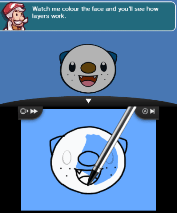 La pantalla táctil será nuestra mesa de trabajo mientras que la superior servirá de pizarra con las instrucciones y modelo que estemos tratando de recrear. Pulsando L desharemos el último movimiento ejecutado mientras que con R lo reharemos. La variedad cromática es muy amplia y la cantidad de grosores o el zoom hacen de la experiencia algo muy completo, sin echar de menos nada ni sentirnos incómodos o limitados más allá de ser conscientes de que nos encontramos con una consola portátil. El propio juego nos insta a tomar posturas inverosímiles a la hora de sujetar la máquina, sin miedo a las vueltas que le demos con tal de lograr los resultados deseados.