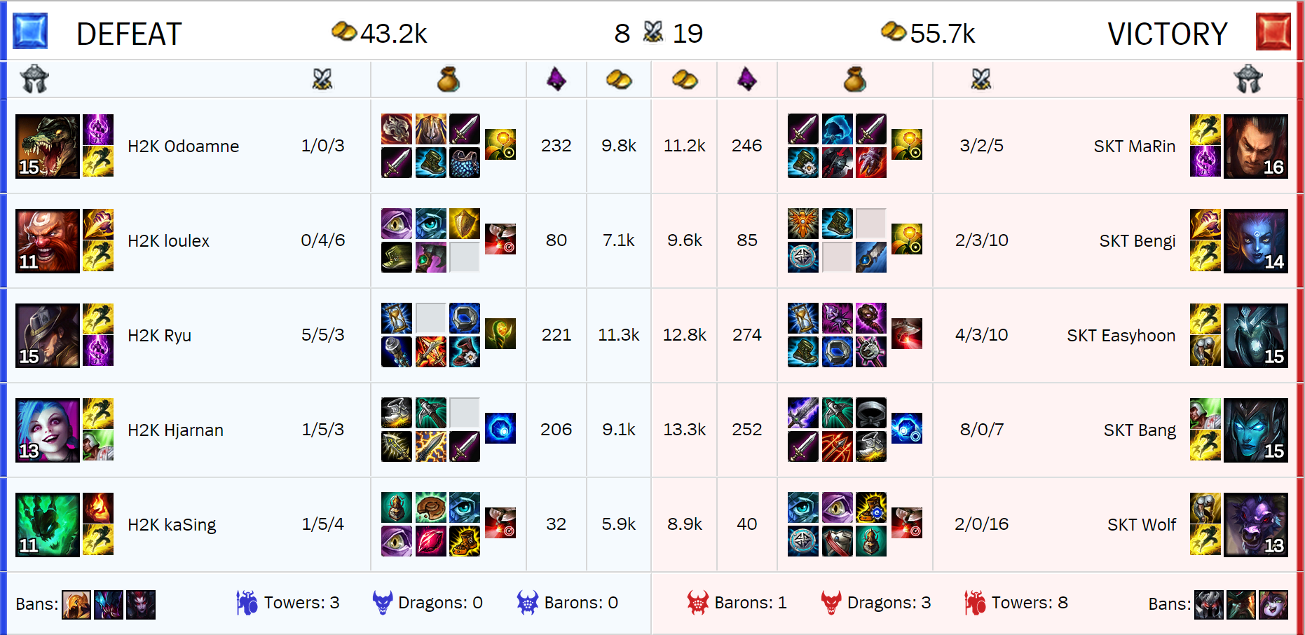 La partida empezaba fatal para H2K. Ryu moría a manos de Bang al minuto 1:40, dando la primera sangre nada más respawnear los minions. La botlane de SKT dominaba y aplastaba a la comprendida entre KaSing y Hjarnan. Kalista se colocaba 4-0 después de una teamfight en la botlane que salía igual para ambos equipos, cediendo a uno de sus compañeros cada uno. Pero SKT dominaba en todas las líneas, en farmeo, en Kills y en nivel demostrado, como nos tienen acostumbrados estos magníficos jugadores.