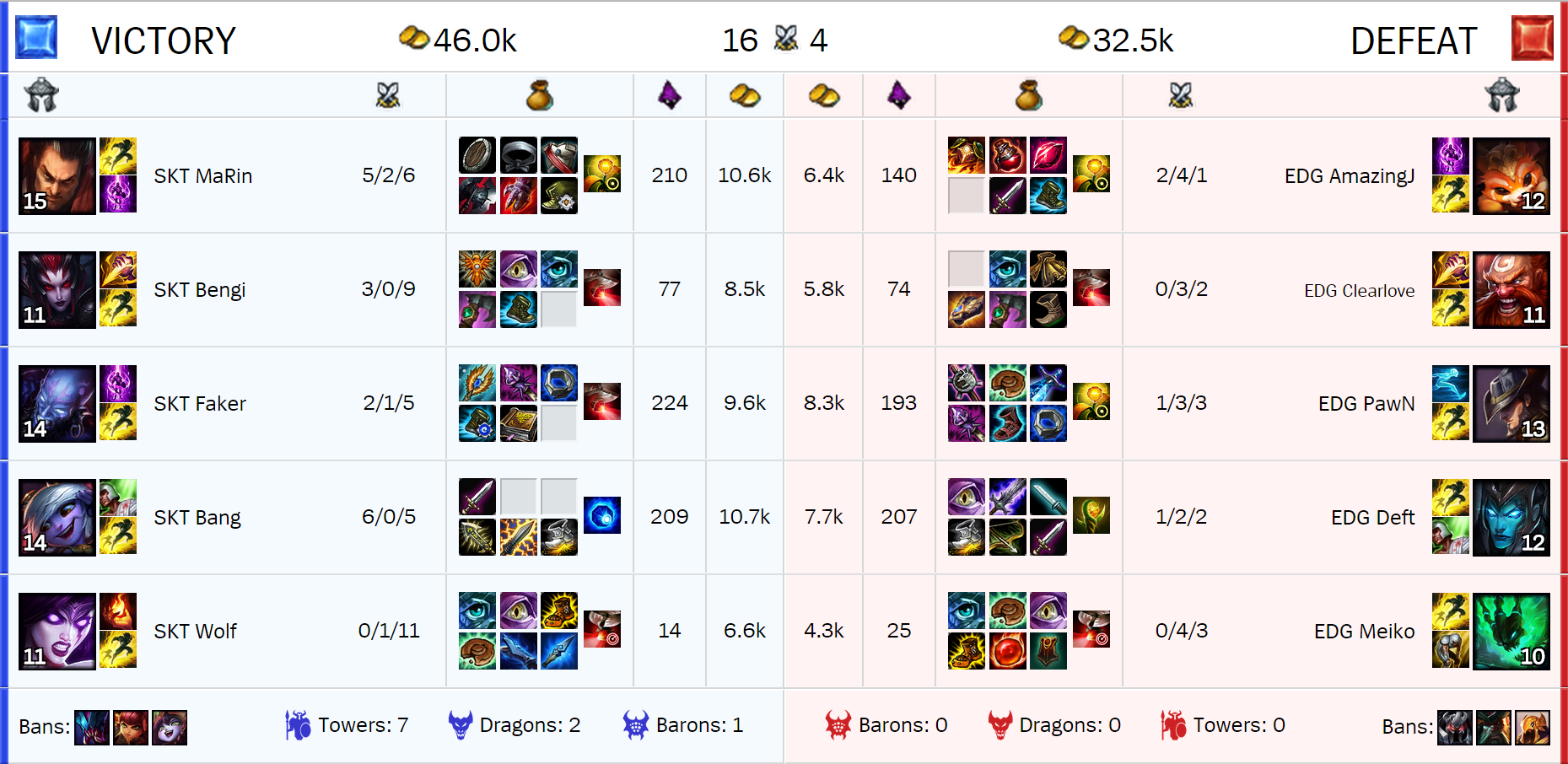 La primera sangre llegaba muy rápida. Al minuto 4 SKT le ha tendido una trampa a Gnar. El minimo ha sido gankeado y diveado bajo torre forzando la primera sangre para el equipo Coreano. De esta misma manera, llegaba la segunda sangre de la partida unos minutos más tarde. SKT se colocaba 2-0 en el marcador y esto pintaba muy bien. EDG intentaba rasgar alguna baja para su equipo en la botlane, matando al Support Coreano, pero esto les ha costado la vida de uno de sus jugadores también, por lo que no era muy worth it (rentable). Incluso Faker ha querido unirse a la fiesta venciendo en un limpio 1v1 a Pawn en la midlane. Los chinos estaban totalmente fuera de la partida, SKT leía todos sus movimientos. Ésto, se ha demostrado cuando al minuto 18, un magnífico SKT ha provocado un Ace contra el equipo Chino, solo cediendo a uno de sus compañeros como premio de consolación. Sk Telecom dominaba en Objetivos y en Torres, en Oro, en Farmeos y en Kills. Edward Gaming no podía hacer nada, solo verlas venir. Era imposible frenar a los Coreanos, y los mismos, no tienen fama de throwear las partidas. Basándome en esta teoría, SKT ha aplastado a EDG, siguiendo invicto, colocándose muy destacado y liderando el Grupo C, en tan solo 23 minutos.