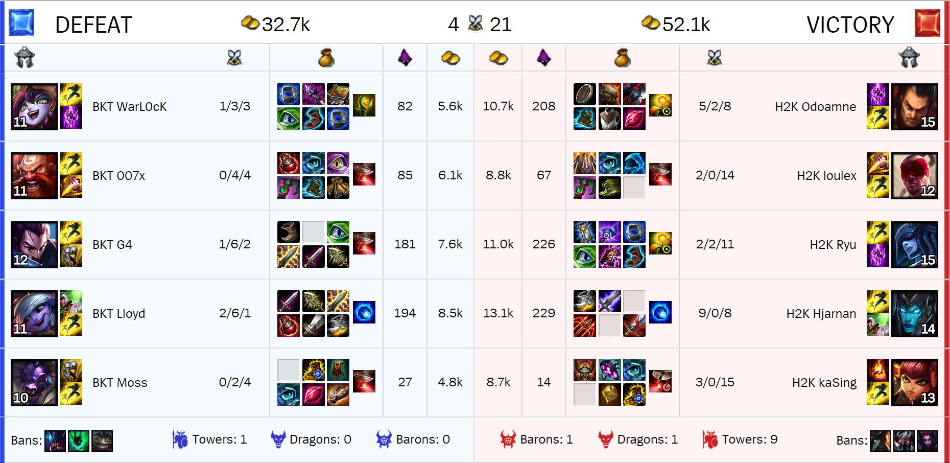 Nuestros pobres amigos de Bangkok no ganan ni un solo partido y esto es así. Hoy no iba a ser menos después de ser brutalmente apalizados por uno de los equipos de nuestra Región. La Primera Sangre se hacía de rogar, pero sobre el Minuto 10 la teníamos en nuestro poder, siendo para H2K. Da igual en qué línea miráramos que H2K estaba dominando, hasta los Dragones se los llevaban los Europeos. En toda la partida solo han muerto 2 de los jugadores de H2K, ambos, un par. Ha sido una partida demasiado agresiva, a una media de muerte por minuto. H2K rasgando kills por posicionamiento, en 1v1, en teamfights, baiteos… Facilísimo. El midlaner de Bangkok demostrando un nivel pésimo (a nivel de Worlds hablando) con Yasuo. Un Warlock que ha farmeado solamente 87 minions en 25 minutos. Un farmeo que, sin exagerar, cualquier Bronce supera. Ninguno de los Titanes ha sido clave, ni siquiera ha destacado por encima, porque ha jugado algo mejor que sus compañeros. Un partido para Europa que sirve de calentamiento para el verdadero partido que les espera a lo largo del día.