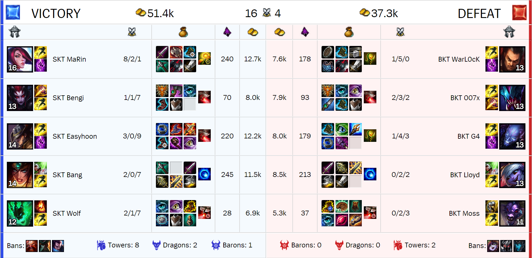 La primera sangre llegaba para SKT, al minuto 5, un gankeo muy fácil en Top que acaba en Kill. SKT vuelve a hacer lo que hizo cuando jugó contra ellos de nuevo. Se adelantaron en Kills, en farmeos, en buffos, en objetivos, en teamfights y buenas decisiones… Todo en cualquier línea, hasta en los junglas había mucha diferencia. Nada más que añadir. Una partida Stompeada como era de esperar, siendo BKT el almuerzo de unas fieras como son SKT.