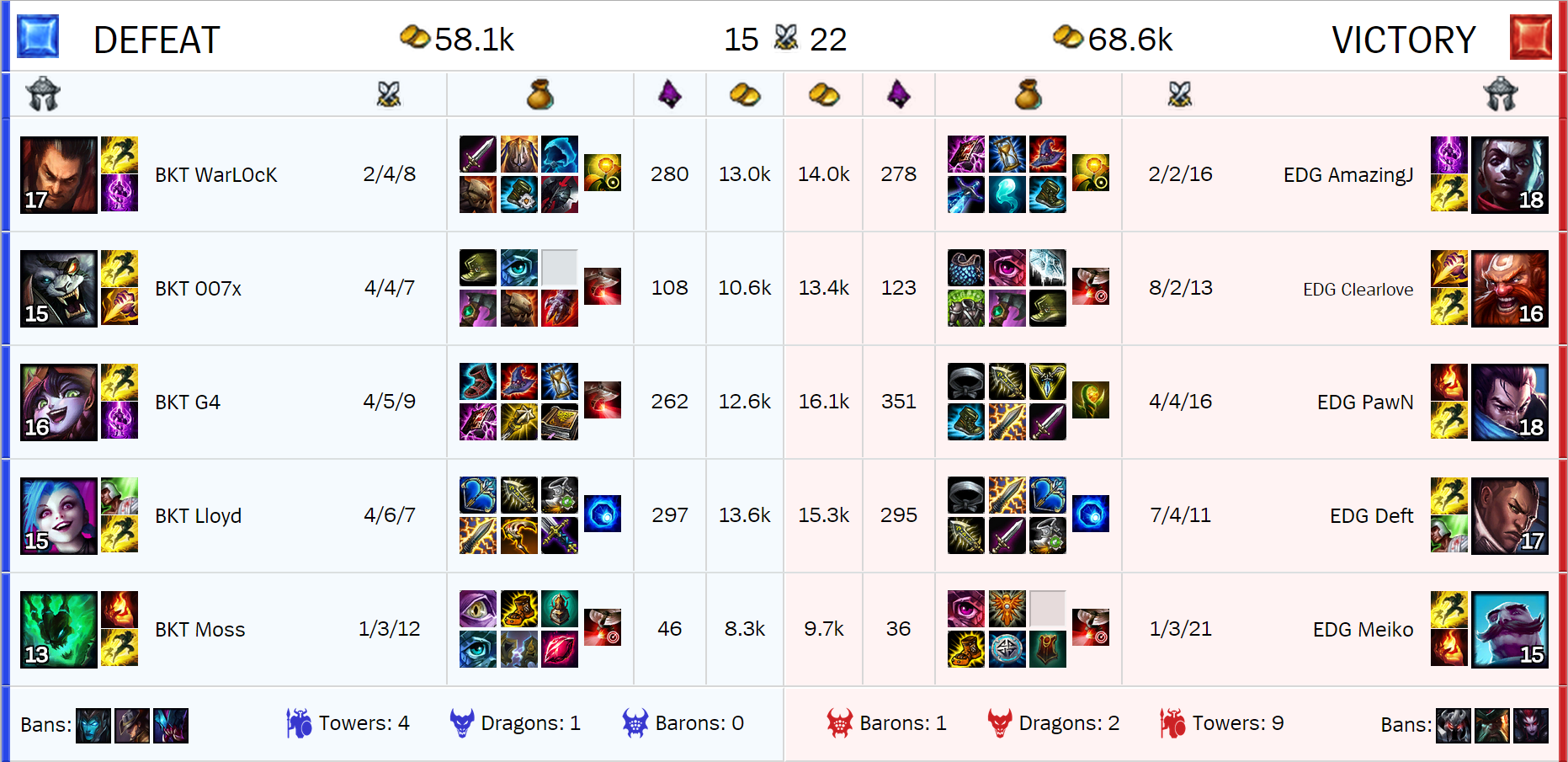 El equipo Tailandés que no ha ganado aun ningún partido se enfrentaba a uno de los mejores equipos chinos, Edward Gaming. Bangkok Titans, si perdía este partido, ya no tendría posibilidad de clasificarse para Cuartos de Final, mientras que si lo ganaba Edward Gaming, tendría un pie en Cuartos de Final junto a SKT.