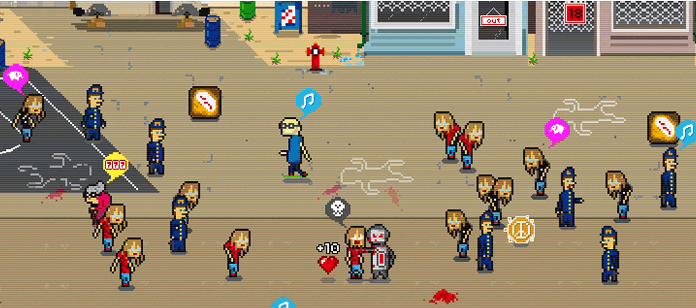 El poco tiempo que he podido dedicarle me basta para deciros que es endiabladamente difícil. Para cada tipo de personaje debes obtener un cebo específico (donuts para policías, «símbolos de la paz» para los hippies) y es tan aleatoria la posición y el tipo de cebo es tan aleatorio que la duración de las partidas suelen verse más determinada por la suerte que tienes que por tu habilidad. Mientras que los policías te dan 30 segundos de vida los hippies tan solo te dan 10 y este tiempo no es acumulable, una vez lo coges es lo que tienes, y a todo esto hay que sumar que chocar con alguien supone unos segundos de parálisis.