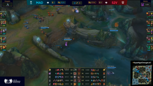 El primer partido enfrentó las escuadras de MAD Lions Madrid contra S2V Esports. A priori, este era un partido donde se esperaba el resultado: MAD Lions arrasó en todos los instantes del encuentro a un S2V que nos supo dar la mejor cara, con un Werlyb recién traído de su retiro en LEC y que mostró que es dominar el carril superior frente un Acidy que se vio claramente sobrepasado.