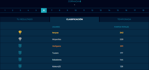 ¡Ah! Y no olvidar la clasificación de la jornada en el fantasy de AKB. Esta jornada se me olvidó guardar el roster, pero bueno, ya tengo listo el siguiente 😉 ¡Podéis apuntaros aquí mismo!
