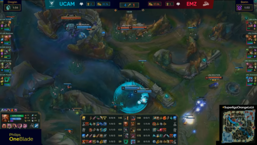 Comienzos lentos como marca el meta, la partida arrancó en una jugada en medio a minuto 16 que iniciaba Kubu sobre Rafitta con follow up de Freshx. Pese a lo buena que era la idea, UCAM consiguió no solo darse la vuelta sino, literalmente, obliterar a sus rivales con una espectacular teamfight donde, comenzando por Xixauxas, todos los miembros de eMonkeyz fueron cazados en la misma jugada casi de uno en uno.