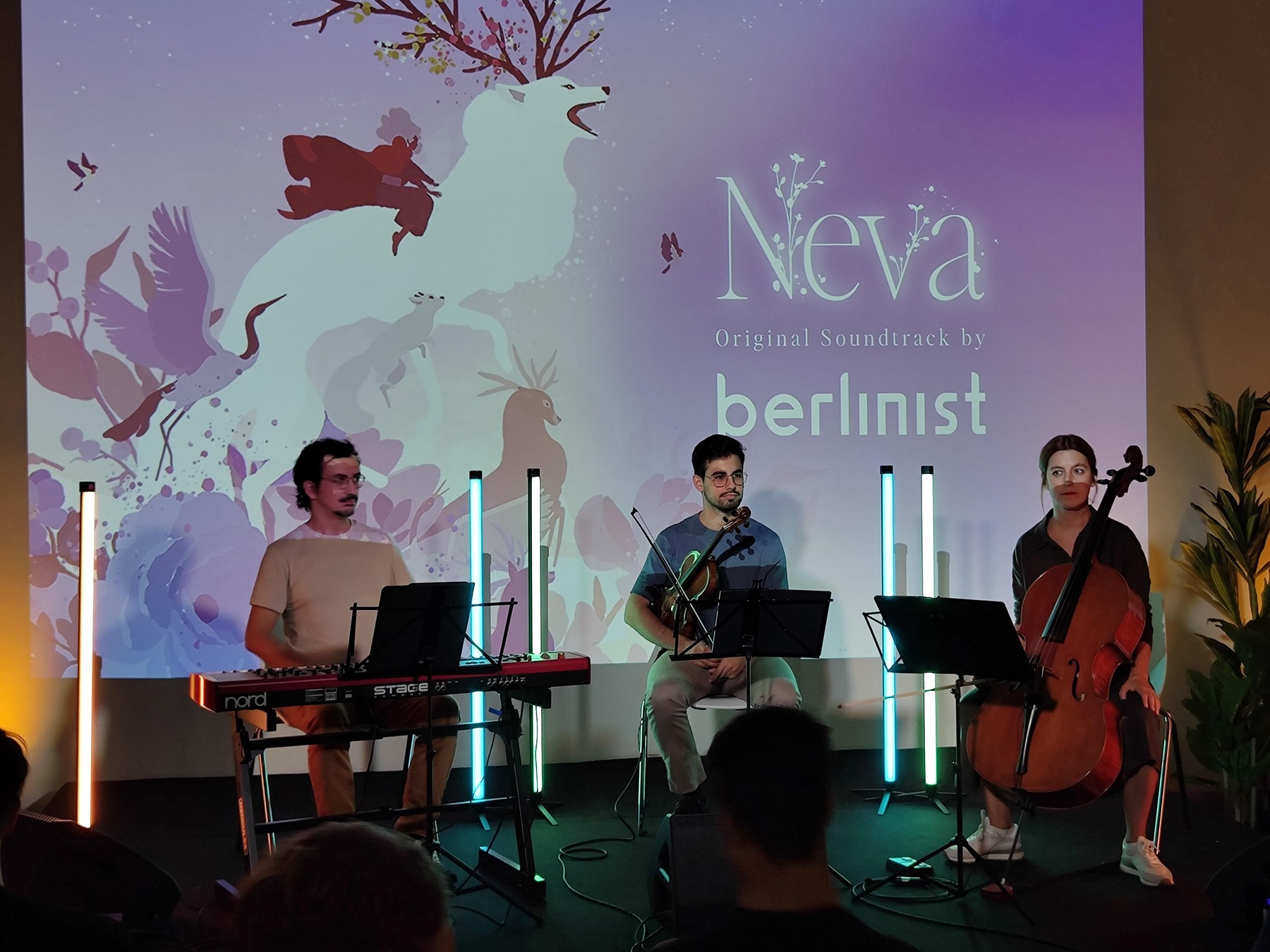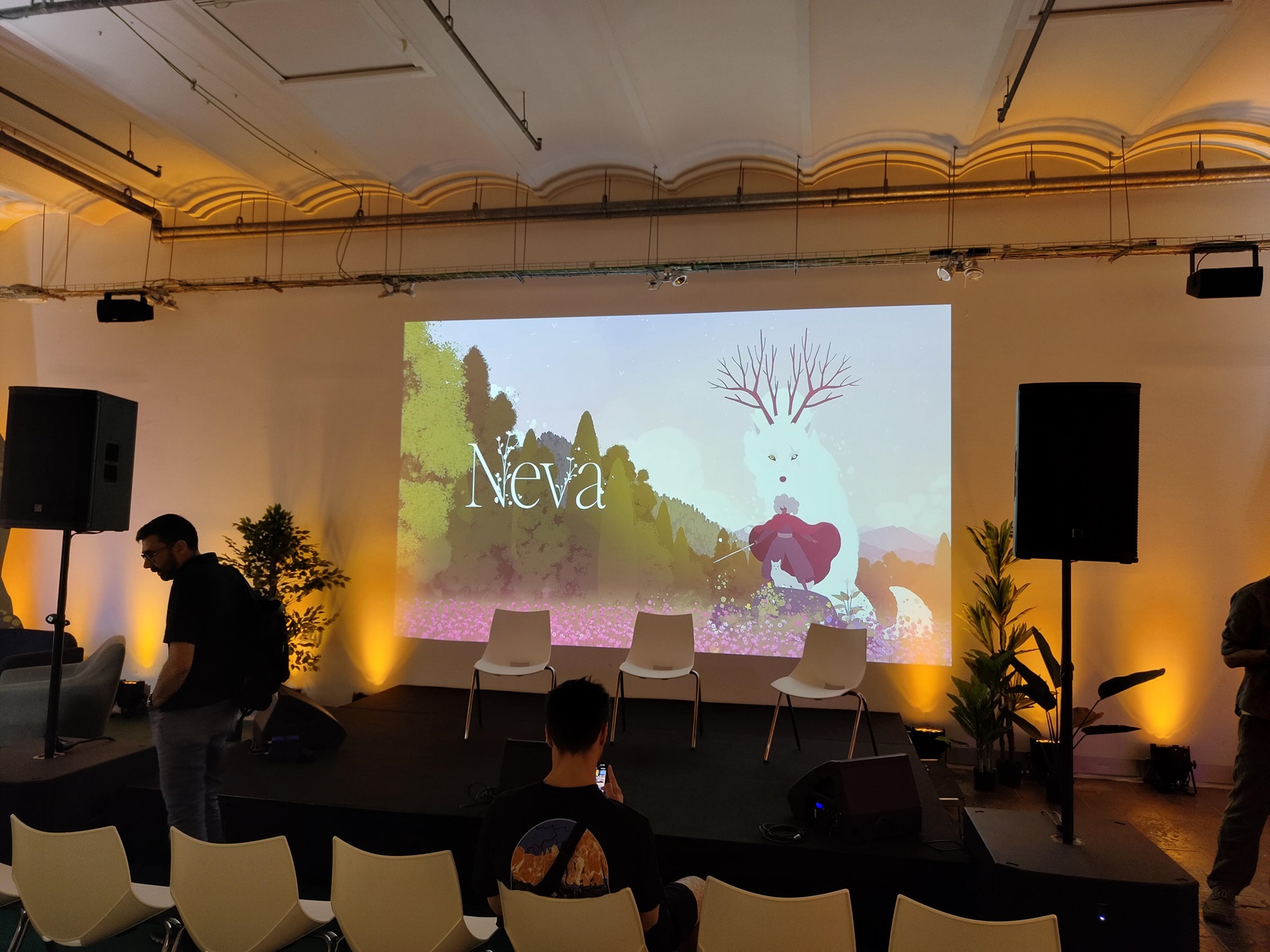 Cabe destacar la habilidad de los responsables de prensa de Nomada, Devolver y Cosmocover que, sabiendo de las fortalezas del estudio, dispusieron una pequeña galería de arte donde poder deleitarse con algunos fotogramas del juego, zonas para poder sacarte un selfie con Neva y Alba, una zona de sofás donde probar relajadamente el juego y un escenario compacto donde poder escuchar las reflexiones de los creadores del juego y donde pudimos disfrutar de un breve concierto inspirado en la banda sonora del juego.