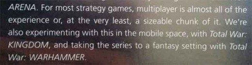 Ahora, quién sabe si debido a un error (intencionado o no), parece haberse desvelado el futuro próximo de este asunto de una forma un tanto rocambolesca. El estudio tenía pensado lanzar un libro de arte sobre la saga Total War el mes que viene, lo que los usuarios no esperaban tras recibir las primeras unidades de esta obra es que, en sus páginas finales, Mike Simpson desvelaría el que sería el próximo título de la saga, Total War: Warhammer.
